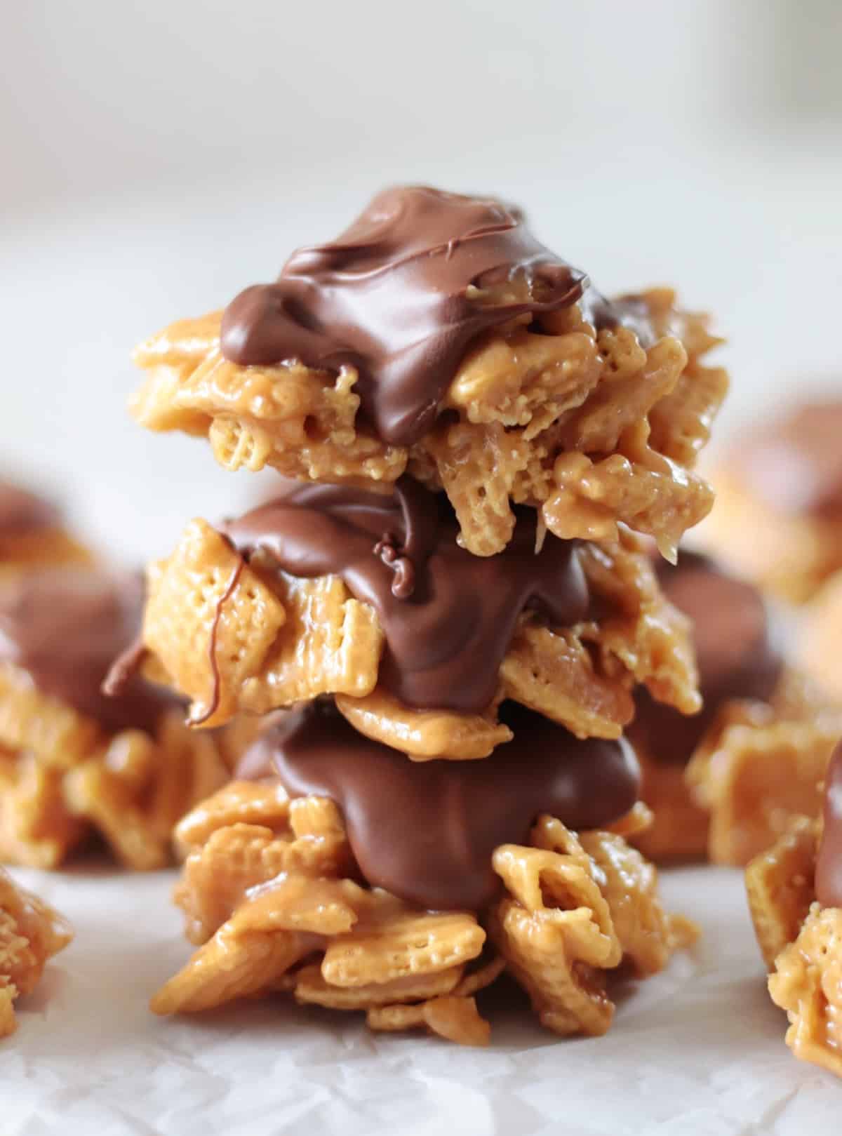You can use any type of Chex cereal that you'd like! For more authentic scotcheroo clusters, use rice Chex which tastes similar to Rice Krispies. I prefer corn Chex.