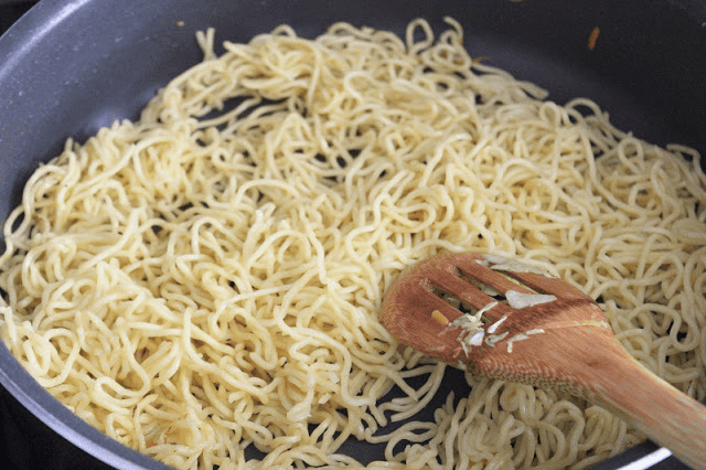 - Add another tablespoon of oil to the skillet over MED-HIGH heat and heat your noodles for a minute or so. There is no need to boil or cook these before adding them to the pan.